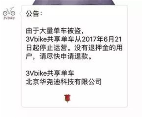 6月21日,共享單車平臺(tái)3Vbike對(duì)外宣布稱,由于單車大量被盜,即日起停止運(yùn)營(yíng)。并提醒沒(méi)有退押金的用戶盡快申請(qǐng)退款。