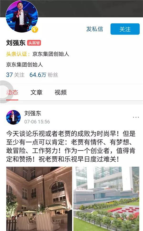 京東集團(tuán)創(chuàng)始人劉強(qiáng)東在個(gè)人認(rèn)證頭條號(hào)對(duì)樂視表示聲援,劉強(qiáng)東稱:今天談?wù)摌芬暬蛘呃腺Z的成敗為時(shí)尚早!但是至少有一點(diǎn)可以肯定:老賈有情懷、有夢(mèng)想、敢冒險(xiǎn)、工作努力!作為一個(gè)創(chuàng)業(yè)者,值得肯定和贊揚(yáng)!祝老賈和樂視早日渡過(guò)難關(guān)!