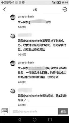 “你到時(shí)候把商品的鏈接給我,然后就是你的收貨地址,每件商品你要給我2塊錢的押金,到了11號(hào)那天,我來幫你搶東西,然后付款,沒搶到的話我會(huì)退押金,搶到的東西會(huì)直接由賣家郵給你,我把交易成功的截圖發(fā)給你之后,你給我付尾款就行了。”這位出租“購(gòu)物車車位”的商家說,之所以每件商品需要支付2元的押金,是為了防止違約。