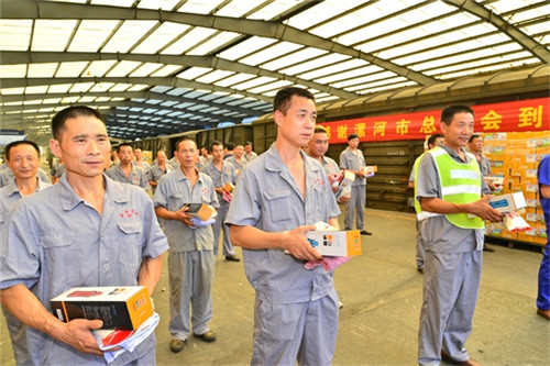 7月24日上午,烈日當(dāng)頭,漯河市總工會黨組書記、常務(wù)副主席吳花蕾,市總工會副主席張煒一行在雙匯集團(tuán)工會主席劉清德陪同下來到雙匯儲運公司慰問一線員工,為他們送去了飲水杯、毛巾、白糖、葡萄糖飲料等防暑用品,炎炎夏日里給廣大員工送去絲絲清涼。