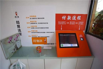 將商品放置在打包臺(tái),有打包袋可以自行取用,旁邊的電腦上也就顯示了所購(gòu)商品的數(shù)量和價(jià)格,選擇微信或是支付寶結(jié)算,調(diào)出付款碼,在電腦旁掃碼裝置上掃描就可以完成結(jié)賬,這時(shí)候,超市出去的大門就打開(kāi)了。