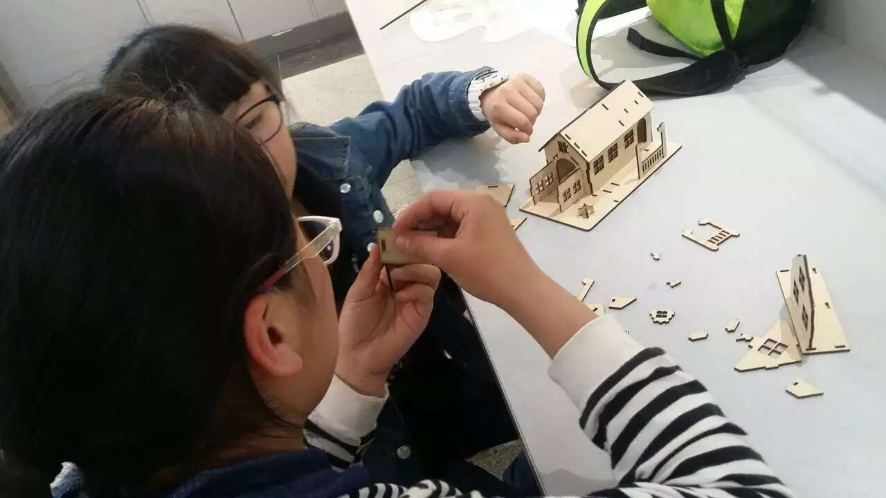 在激光加工區(qū),用激光機(jī)切割而成的大小不一、形狀各異的零件引起了同學(xué)們的興趣。同學(xué)們齊心協(xié)力,將一個(gè)個(gè)零件拼裝成了房屋模型??粗粭潡潉e墅呈現(xiàn)在眼前,孩子們歡呼雀躍,體驗(yàn)著動(dòng)手動(dòng)腦的樂(lè)趣,感受著成功的喜悅。