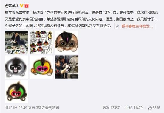 春晚吉祥物康康由“福娃”的創(chuàng)作者之一韓美林設(shè)計(jì),官方稱是以中國(guó)傳統(tǒng)水墨畫(huà)的藝術(shù)形式,生動(dòng)表現(xiàn)出“猴”的機(jī)靈活潑特點(diǎn)??纯错n老師的手稿,也是能get到喜慶的氛圍和毛茸茸的手感,還算是只討人喜愛(ài)的猴子↓