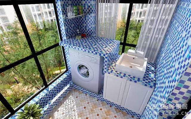 這一款讓人眼前一亮的陽臺放洗衣機效果圖便是地中海風格陽臺,戶主大膽采用藍白相間的馬賽克墻面,配合白色的洗衣機組合柜和洗手池,給人一種置身海邊的感覺。由于陽臺兩面都是落地窗,戶主便在轉(zhuǎn)角的墻面上設(shè)了一個置物架,用來放洗手液、洗衣液、洗面奶等用品,使用起來十分方便。