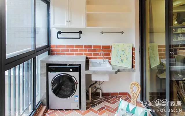 這是一款青春活潑的陽臺,地面和墻面都是復古紅磚風格,加上配合洗衣機的盥洗區(qū)下方的管道直接暴露出來,顯得十分自由隨意,洗衣機上方懸掛的兩個晾曬架,可以用來掛毛巾、小衣物等,這樣的陽臺洗衣機角落實用又有格調(diào),適合年輕人。