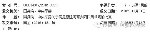 國(guó)務(wù)院 中央軍委關(guān)于同意新建河南安陽民用機(jī)場(chǎng)的批復(fù)