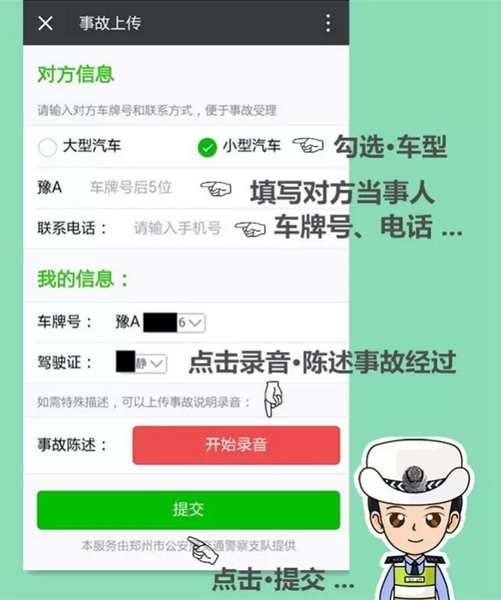填寫“事故描述”相關(guān)內(nèi)容,輸入對方車號和聯(lián)系方式。并在事故陳述處點(diǎn)擊“開始錄音”,描述事故發(fā)生詳細(xì)地點(diǎn)和成因后提交。