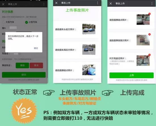 該功能上線后,親們,再也不用站路邊“說個(gè)舌尖帶火,嗓子冒煙”了,只需拍幾張現(xiàn)場,照片發(fā)個(gè)微信就可以馬上閃人、撤離事故現(xiàn)場!既不造成交通擁堵又安全省力。