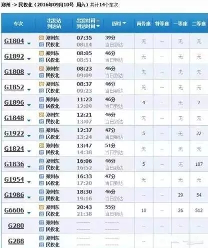 最快的一趟車G368/9,19點(diǎn)05分從上海虹橋始發(fā),23點(diǎn)02分到達(dá)鄭州東,耗時(shí)3小時(shí)57分,中途僅停靠南京和徐州站,其余列車運(yùn)行時(shí)間都在4小時(shí)到5小時(shí)之間。