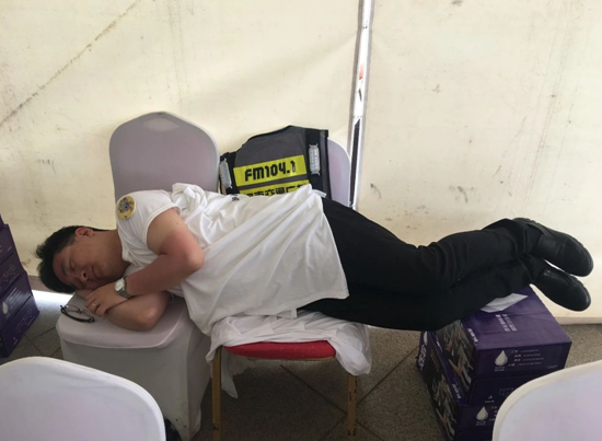 為了保證大家順利進(jìn)園,《南方談交通》的主持人劉翔第一天就被曬傷了,間隙時(shí)間,拼出來兩個(gè)凳子就瞬間睡著。