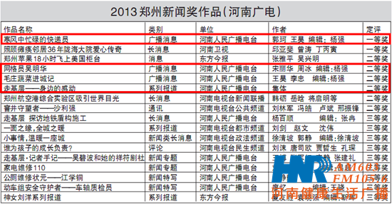 首屆“鄭州新聞獎”在北京評審,評委會對參評作品進行了認真細致的評議,經(jīng)過初評、定評共評出特等獎3篇、一等獎14篇、二等獎30篇、三等獎42篇。頒獎會對獲獎?wù)哳C發(fā)了證書和獎杯,并給予一等獎5000元、二等獎3000元、三等獎2000元的獎勵。河南人民廣播電臺報送的作品以新聞性強、主題重大、思想深刻、制作精良、廣播特色突出而獲評委好評。其中河南電臺信息廣播郭珂、王昊采寫的消息《寒風中忙碌的快遞員》,通過對鄭州市一名普通快遞員劉師傅的跟隨式采訪,將他真實的工作狀態(tài)和內(nèi)心世界一一展現(xiàn),生動、感人,獲得了一等獎;《網(wǎng)格員吳明華》、《毛莊蔬菜進城記》、《走基層——身邊的感動》 3 件作品獲得二等獎;《走基層 探訪地鐵盾構(gòu)施工》等5件作品獲得三等獎。河南電臺信息廣播記者郭珂作為獲獎記者代表在頒獎會上發(fā)了言,表示要按照河南臺的要求和安排,進一步轉(zhuǎn)變作風,寫出面貌一新、聽眾喜聞樂見、無愧于偉大時代的作品來。