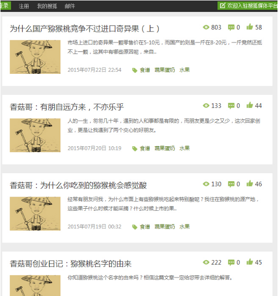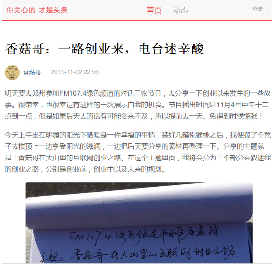 自媒體,以“香菇哥”的名義在各個(gè)自媒體平臺(tái)申請(qǐng)入駐,最先申請(qǐng)的是搜狐媒體平臺(tái),運(yùn)作的這幾個(gè)月,搜狐上的累計(jì)閱讀量目前已達(dá)到16萬。后來又申請(qǐng)了今日頭條,一點(diǎn)咨詢,鳳凰新聞媒體平臺(tái)等渠道。也建立了自己的微信公眾號(hào)。目前所有的宣傳渠道的累計(jì)閱讀量已經(jīng)突破了七十萬。就是在這些渠道上宣傳自己的創(chuàng)業(yè)故事以及大山里面的人文風(fēng)情來傳播。