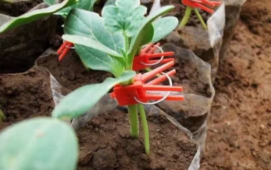 多采用頂插接法,以西瓜子葉呈“丫”字形到展平期為嫁接適期。嫁接時先用刀片削去砧木真葉及生長點(可在嫁接前2~3天摘除,促進下胚軸增粗,有利于提高嫁接成活率和操作方便),然后用竹簽順子葉連線方向下斜插入砧木胚軸,深約0.5~1㎝。(注意:竹簽尖端達到子葉下胚軸的另一側(cè)皮層,頂在該部位的手指有觸感時為宜)。取出接穗,用刀片在子葉下1~1.5㎝處斜削,使之或“十” 形,隨后迅速拔出砧木中的竹簽,將接穗準確地按竹簽插入方向,斜插入砧木孔中。接好后接穗的子葉方向與砧木的子葉成“十”子形交叉。