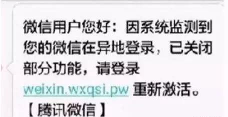 #最新詐騙手法#【收到微信帳號(hào)異地登錄短信時(shí)要警惕!】近期很多人收到這樣的短信:“微信用戶您好:因系統(tǒng)監(jiān)測(cè)到您的已微信在異地登錄,并已關(guān)閉部分功能,請(qǐng)登錄weixin.wxqsi.pw重新激活?!掘v訊微信】”。廳哥提醒:這其實(shí)是一個(gè)由偽基站發(fā)來(lái)的詐騙短信,一旦打開鏈接,很有可能被誘導(dǎo)輸入微信帳號(hào)、微信密碼、支付密碼、驗(yàn)證碼等,后果不堪設(shè)想……
