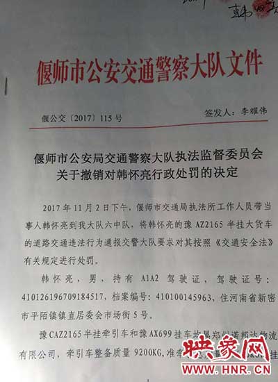 17日下午13時(shí)許,在廣電南路上,法制科黎科長(zhǎng)和督察李警官帶著“偃師市公安局交警大隊(duì)執(zhí)法監(jiān)督委員會(huì)關(guān)于撤銷(xiāo)對(duì)韓懷亮行政處罰的決定”文件與韓先生見(jiàn)面。