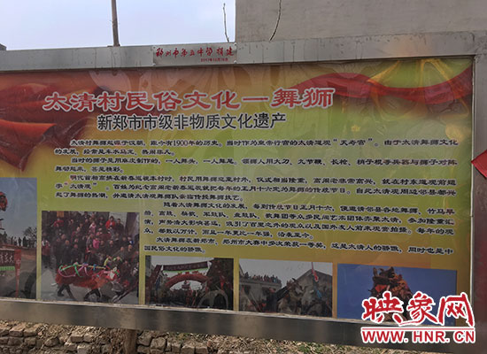 太清村村主任王會甫介紹,他們村的舞獅、舞龍表演,始于1900年前的漢代。明代首相(首輔)高拱在新春巡視太清村時,村民組織高規(guī)格的舞龍、舞獅表演隊來歡迎首輔,規(guī)格很高。高拱非常高興,當(dāng)場在村里的太清觀前題詞。百姓們?yōu)榱思o(jì)念高拱在新春巡視,就把每年的正月十六定為舞獅的傳統(tǒng)節(jié)日。自此,周邊鄰縣都興起了舞獅熱潮,并在正月十六這一天匯集到太清村進(jìn)行舞獅表演,延續(xù)至今。太清村的舞獅隊在2002年獲鄭州市舞獅大賽一等獎。