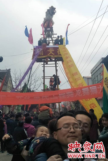 新鄭市觀音寺鎮(zhèn)太清村,新鄭、長葛、禹州的三縣交界處。3月3日下午15時許,太清村的街上人山人海,水泄不通。各條街道上鑼鼓喧天,熱鬧非凡。多個舞獅團(tuán)隊開始在高高樹起的架子上表演,地面上各種各樣的民間表演爭奇斗艷。