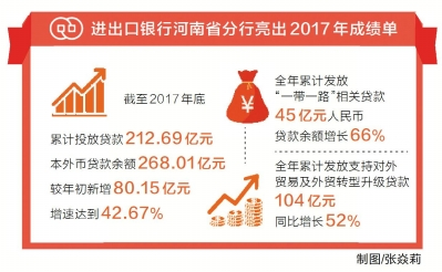 1月29日,進(jìn)出口銀行河南省分行行長吳啟金表示,過去一年,分行努力貫徹習(xí)近平新時(shí)代中國特色社會(huì)主義思想,助力河南打造內(nèi)陸開放新高地。截至2017年底,進(jìn)出口銀行河南省分行累計(jì)投放貸款212.69億元,本外幣貸款余額268.01億元,有力助推我省企業(yè)“走出去”。