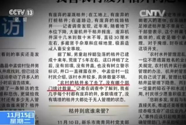 有河北媒體調(diào)查顯示,當?shù)剞r(nóng)村枯井很多,但并沒有具體部門統(tǒng)計數(shù)量。在河北幾乎每個村都有廢棄的枯井,除多數(shù)填埋外,未填埋的枯井大多處于無人管理的狀態(tài)?!翱菥兿葳?,根子在沒人管?!庇忻襟w這樣評論。