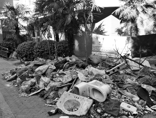 小區(qū)14號樓前樓梯口垃圾成堆:裝修廢渣、木板、鋼材塞滿垃圾桶,其中夾雜著各色生活垃圾,幾個(gè)廢棄的馬桶泛著扎眼的白光,還沒走近一股惡臭就撲面而來……