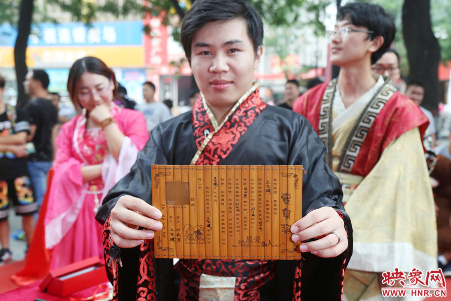 下午17點(diǎn)30分,鄭州二七廣場(chǎng)附近的一處小廣場(chǎng)前熱鬧非凡,8對(duì)年輕男女身著古裝,參加愛(ài)的“賣(mài)身契”簽約儀式。