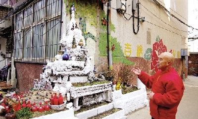 北側(cè)居民樓東南拐角被他建了一座假山,假山2米多高,山頂鑲嵌酒瓶作為裝飾,山腰處則安裝了寶塔等物,他稱假山為“福山”,進入小區(qū)不但要感受居民的好客和熱情, 還要感覺到滿滿的幸福。