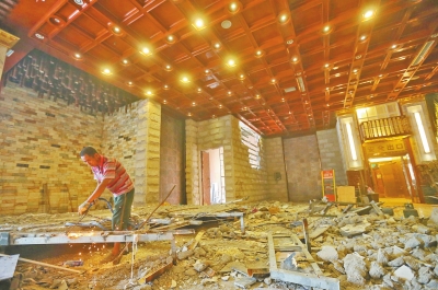 大廳內(nèi),金碧輝煌的樓頂和墻體以及各種燈飾等都還沒有拆除,大廳東側(cè)的一處1尺高的平臺正在拆除。在切割、拉扯、裝卸等雜音交響中,東北角一名工人拿著大錘對著室內(nèi)非承重墻猛砸,已砸出一個大窟窿。很顯然,這里正進(jìn)行大規(guī)模拆除。