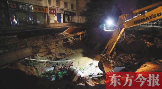 昨日21:26許,現(xiàn)場調(diào)來一輛挖土機,開始路面開挖施救。據(jù)市政部門介紹,塌方約600平方米,長約30米、寬約20米,深四五米。
