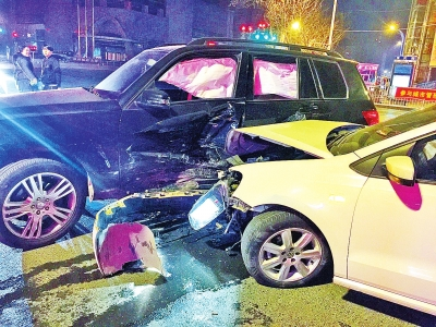 車禍發(fā)生時,已是2月15日的凌晨4時許,在紫荊山路與東大街交叉口,發(fā)生碰撞的兩輛車為一輛大眾Polo轎車和一輛奔馳GLK越野車。大眾轎車攔腰撞上奔馳車,兩車均受損嚴(yán)重變形。