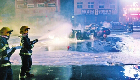 事故現(xiàn)場(chǎng),消防員對(duì)起火車輛進(jìn)行撲救。