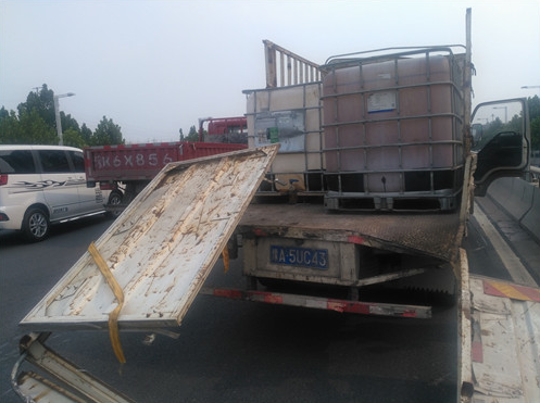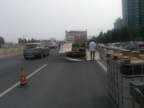 據(jù)貨車(chē)司機(jī)介紹,他車(chē)上拉的這些邊長(zhǎng)約1米的方形大桶是裝醬油用的,當(dāng)天拉著這些空桶從新鄭來(lái)到鄭州,因?qū)β窙r不熟,不知道此處上橋口有3米的限高桿,直到上橋時(shí)撞上限高桿后,才知道貨車(chē)不讓上三環(huán)立交橋。