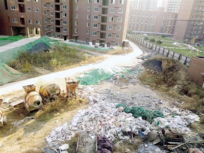 王女士介紹他們小區(qū)是清華·紫光園一期,與二期工地僅一墻之隔。8號樓從二樓起就能看到下面的工地,窗戶朝南原本是個好方向,冬天太陽可以曬到屋里來,還可以經常開窗通風。但因樓下工地垃圾成堆,樓上的住戶都不敢輕易開窗,經常有各種惡臭飄進房間。