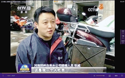 1月4日,大雪紛飛,穿著短袖搞搶修的張威,迅速火爆了朋友圈和媒體圈,被親切地稱為“短袖哥”,甚至上了央視新聞聯播。作為一名退伍軍人,張威從2000年就走進自來水公司,扎根一線搞搶修,曾獲得鄭州市職工技術運動會管道工冠軍,被授予市五一勞動獎章。