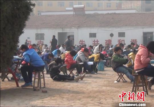 緊鄰臺前縣政府1公里之遙的城鎮(zhèn)中學,由于教室不充裕,學生在室外空地上考試?!《w 攝