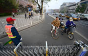 2014年4月2日,北京長(zhǎng)安街上多個(gè)路口增設(shè)了封機(jī)動(dòng)車護(hù)欄,紅燈時(shí)非機(jī)動(dòng)車護(hù)欄拉起,防止非機(jī)動(dòng)車闖紅燈。圖為綠燈亮起,護(hù)欄打開正常通行。