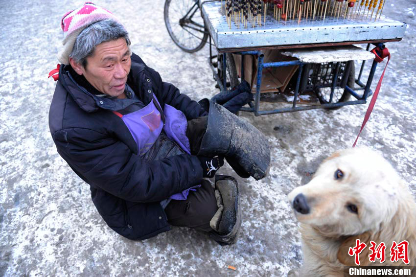 2月6日,在長(zhǎng)春市一條繁華的街路上,一只小狗幫助身殘主人拉車賣冰糖葫蘆,成為長(zhǎng)春冬日街頭一道感人的風(fēng)景線。據(jù)主人介紹,雖然自己身殘且貧窮,但并不想靠別人救濟(jì)度日,因此學(xué)會(huì)了制作冰糖葫蘆的手藝,并以此自食其力。而他養(yǎng)的這條小狗“大黃”也是對(duì)主人不離不棄,每日都會(huì)幫助主人拉車外出謀生。圖為主人在整理捆綁腿的帶子。張瑤 攝