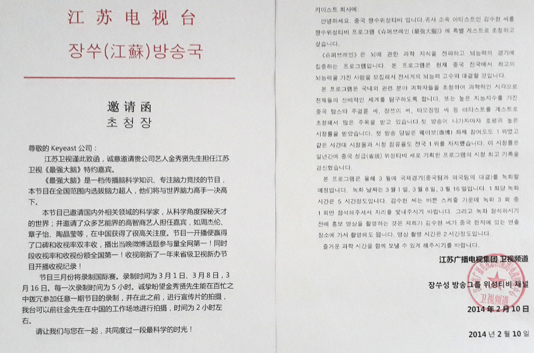 應(yīng)廣大粉絲的強(qiáng)烈呼聲,江蘇衛(wèi)視決定邀請(qǐng)金秀賢參加《最強(qiáng)大腦》國際PK賽的錄制。昨日中午,江蘇衛(wèi)視《最強(qiáng)大腦》在其官方微博發(fā)布了一條重磅消息:節(jié)目組已于2月10日向“都教授”金秀賢所屬的韓國經(jīng)紀(jì)公司Keyeast發(fā)出邀請(qǐng)函,誠意邀請(qǐng)其擔(dān)任《最強(qiáng)大腦》的特約嘉賓。