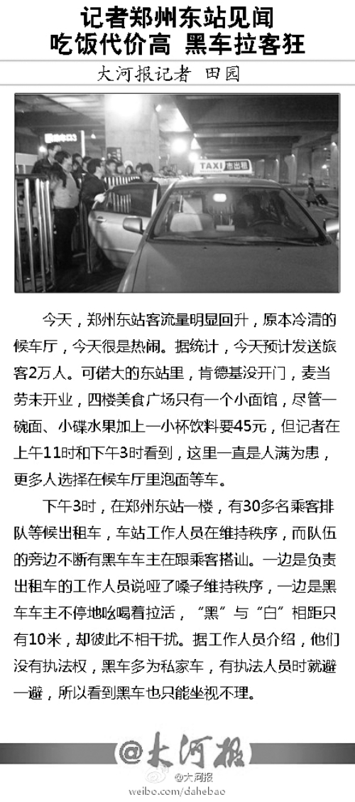 昨天,鄭州東站迎來一次客流小高峰,當(dāng)天,共發(fā)送旅客將近2萬(wàn)人次。記者來到鄭州東站體驗(yàn)發(fā)現(xiàn),平素空曠無人的西廣場(chǎng),出現(xiàn)了很多乘客的身影,三樓候車室也很熱鬧。但與熱鬧場(chǎng)景不相配的是,鄭州東站很多細(xì)節(jié)還未顧及到,吃飯代價(jià)高,“黑出租”與“白出租”公然搶生意。