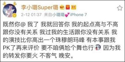這條微博讓李小璐怒了。李小璐隨后轉(zhuǎn)發(fā)并寫道:“既然你@ 我了,我就回答你,我的起點(diǎn)高與不高跟你沒有關(guān)系,我過我的生活跟你沒有關(guān)系,我的演技比你高出一個(gè)珠穆朗瑪峰,有本事跟我PK了再來評價(jià),要不咱倆尬個(gè)舞也行,因?yàn)槲业霓D(zhuǎn)發(fā)你要火,不客氣,晚安?!?/p>
