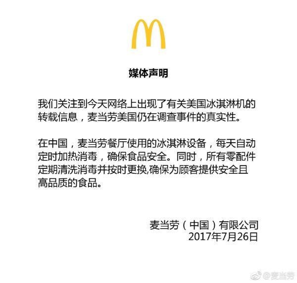 7月26日23時許,麥當(dāng)勞官方微博發(fā)布了《關(guān)于美國冰淇淋機(jī)的媒體聲明》:“我們關(guān)注到今天網(wǎng)絡(luò)上出現(xiàn)了有關(guān)美國冰淇淋機(jī)的轉(zhuǎn)載信息,麥當(dāng)勞美國仍在調(diào)查事件的真實(shí)性。在中國,麥當(dāng)勞餐廳使用的冰淇淋設(shè)備,每天自動定時加熱消毒,確保食品安全。同時,所有零配件定期清洗消毒并按時更換,確保為顧客提供安全且高品質(zhì)的食品。”