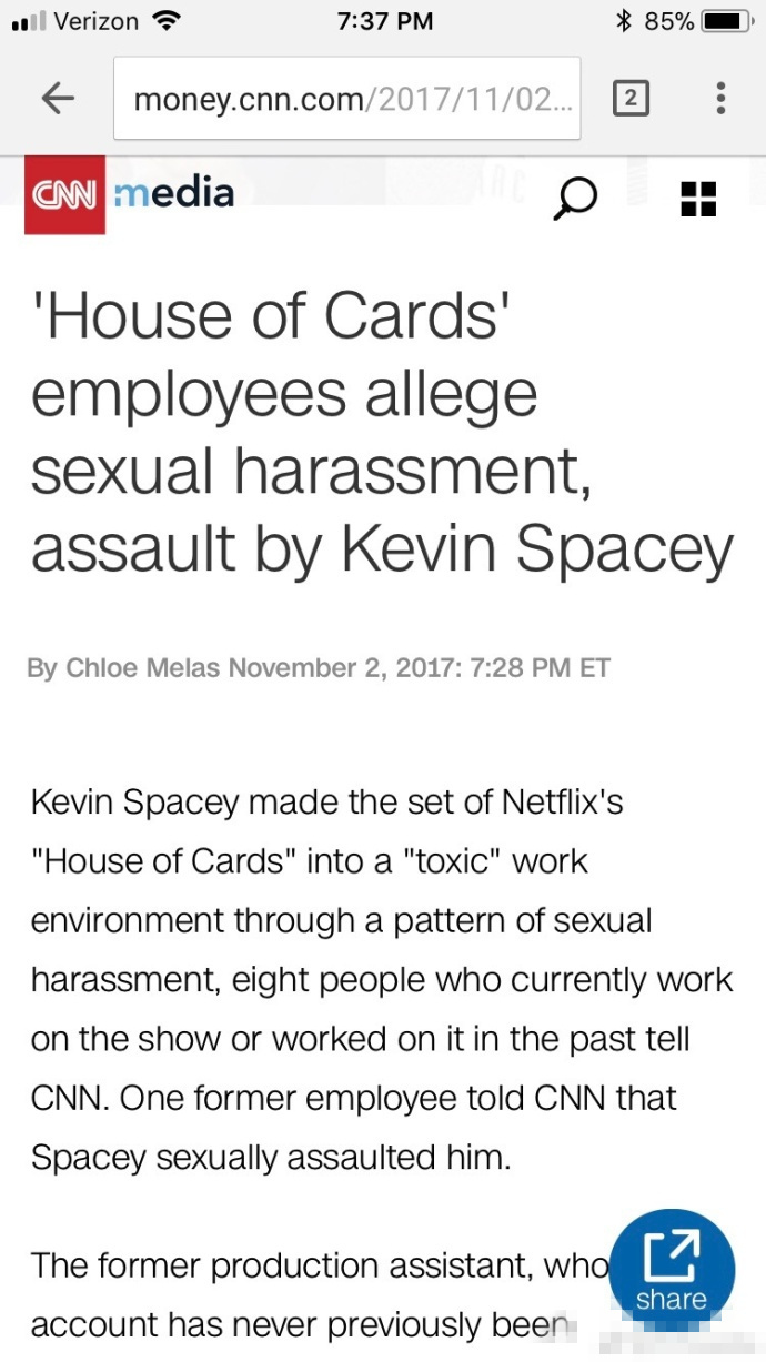 從砍劇到第六季停拍,凱文·史派西性騷擾事件給美劇《紙牌屋》帶來了不小的風(fēng)波。而據(jù)CNN今日報道稱,目前有8名《紙牌屋》現(xiàn)員工及前員工向他們控訴凱文·史派西曾對自己實施性騷擾,其中一名甚至聲稱史派西性侵了他。這8名員工由于害怕講出這件事會對自己的事業(yè)產(chǎn)生影響,采用了匿名的方式向CNN揭發(fā)這件事情,他們稱史派西已經(jīng)是個慣犯,經(jīng)常對年輕男性有性騷擾行為,包括在對方不情愿的情況下觸摸、說一些粗魯?shù)难哉Z等。