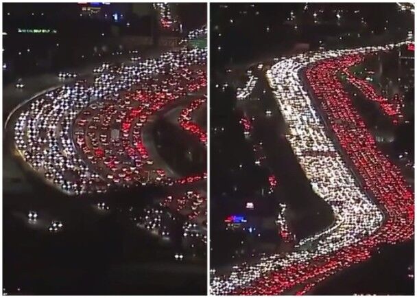 大批美國(guó)民眾在感恩節(jié)提早返回家鄉(xiāng),計(jì)劃與家人迎接這個(gè)節(jié)日。但過(guò)多的人流導(dǎo)致交通嚴(yán)重堵塞,洛杉磯的公路更出現(xiàn)超長(zhǎng)車(chē)龍,如河流般的紅白車(chē)燈更成為一道奇景。