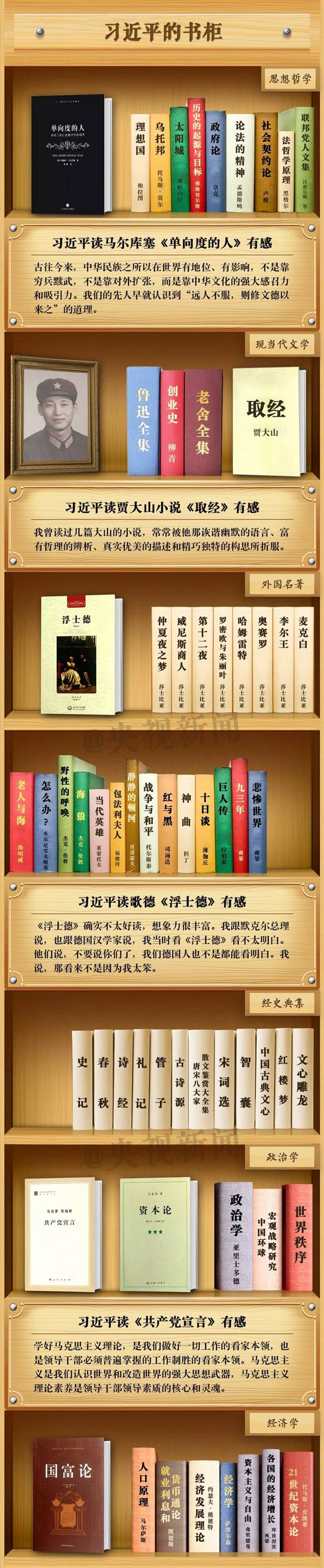 在這個節(jié)日,央視新聞定制了習近平總書記的“書柜”,來看看總書記的“書單”和讀書感悟吧。