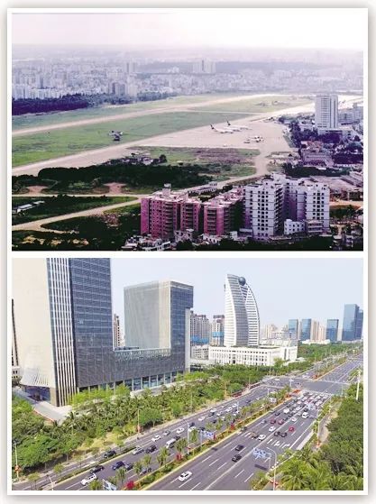 拼版照片為??谑袊d大道,曾經(jīng)是??诖笥⑸綑C(jī)場(上圖為1999年5月新華社記者姜恩宇攝,下圖為2018年4月14日新華社記者郭程攝)。 新華社發(fā)
