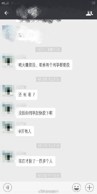 該網(wǎng)友提供的聊天截圖顯示,一個(gè)昵稱叫“大江東去”的人4月21日在班級(jí)微信群中說(shuō)“明天繼續(xù)投,咱班每個(gè)同學(xué)都要投”“沒(méi)投的同學(xué)趕快投下”“現(xiàn)在才投了一百多個(gè)人”。在另一個(gè)名叫“首腦交流群”的微信群中,“大江東去”對(duì)班干部說(shuō):“誰(shuí)不投了,實(shí)習(xí)把她弄到環(huán)境差的地方去”“把話給她們帶到,后果自負(fù)”“周天晚上一個(gè)一個(gè)統(tǒng)計(jì)”“讓那些裝聾作啞的人付出代價(jià)”。