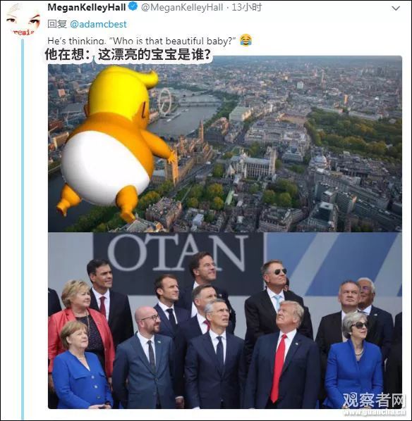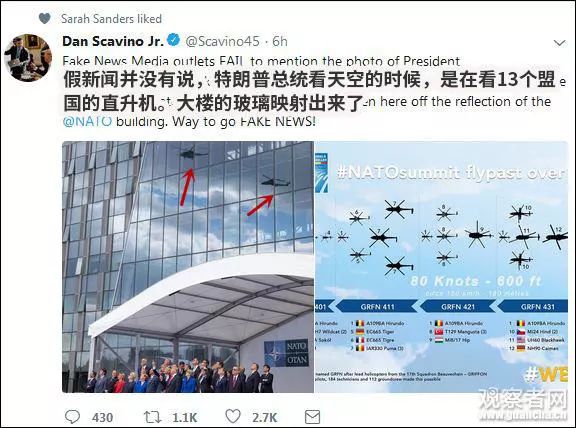 但是,白宮社群媒體主任史卡比諾 (Dan Scavino Jr。)卻站出來指責“假新聞”。他表示,當時各國領(lǐng)導人正在抬頭看天空中飛過的13國直升機,并配上了一張動作整齊劃一的照片。