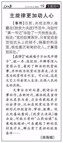 作為十九大的重要獻(xiàn)禮篇,《脫貧大決戰(zhàn)》第二季于10月11日正式播出。從第一季的“認(rèn)識(shí)貧困、了解貧困”,到第二季的“幫扶貧困、解決貧困”,固本求新,展現(xiàn)扶貧工作的現(xiàn)實(shí)意義和顯著成效,彰顯河南在全國(guó)脫貧攻堅(jiān)中的責(zé)任和擔(dān)當(dāng)。節(jié)目播出之后,《光明日?qǐng)?bào)》刊發(fā)《“土氣”背后的擔(dān)當(dāng)精神——關(guān)于大型公益扶貧節(jié)目<脫貧大決戰(zhàn)>》?!度嗣袢?qǐng)?bào)》發(fā)表評(píng)論《主旋律更加動(dòng)人心》,稱贊《脫貧大決戰(zhàn)》是“深入生活、扎根人民的生動(dòng)實(shí)踐”,國(guó)務(wù)院扶貧辦、中宣部、省委省政府、省委宣傳部等多個(gè)領(lǐng)導(dǎo)對(duì)節(jié)目給予充分肯定。