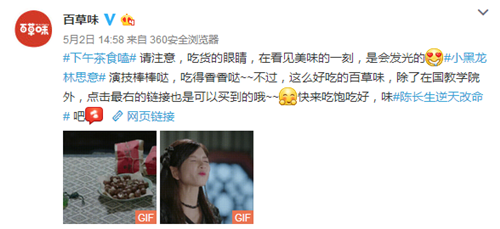 電視劇里收獲滿滿焦點(diǎn),宣傳上,也要給力才行。在廣大觀眾們忙著截圖曬圈時,百草味的官方微博也沒閑著。電視劇播到哪,小編的截圖就跟到哪。緊跟劇情的同時附上店鋪鏈接,讓流量順利轉(zhuǎn)化為銷量。