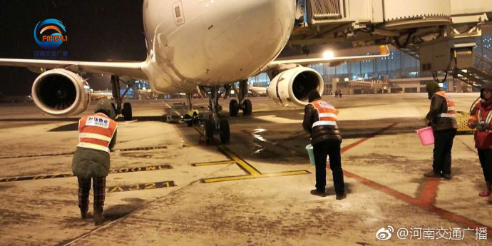 機(jī)場信息:早上七點半,鄭州機(jī)場仍在降雪,經(jīng)全力工作,南跑道正在安排航班起降,但放行速度較慢。北跑道正在除冰,早上出港航班均有不同程度延誤。請廣大乘客拔打96666問訊,為了保障旅客的安全和順利出行,機(jī)場各個崗位徹夜無眠工作。