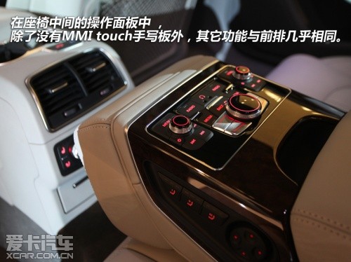 轉(zhuǎn)至后排,這里應(yīng)該同樣是車主們最為關(guān)注的,依靠長軸車型多出的100mm軸距,后排的空間依舊不用擔(dān)心。而影音娛樂系統(tǒng)也同樣沒有被忽視,在座椅中間的操作面板中 ,除了沒有MMI touch手寫板外,其它功能與前排幾乎相同。